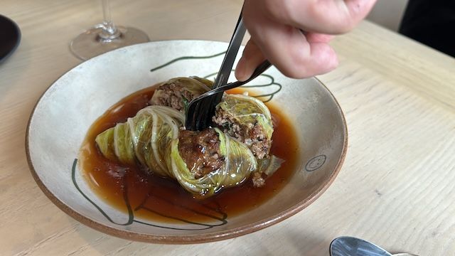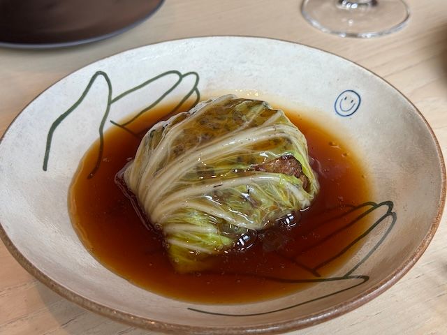 また、メインの「白菜包み」は、まるでフレンチの芸術作品。キムチのロールキャベツと言ってしまえばそれまでですが、その見た目は斬新!中には大きなハンバーグのようなお肉があり、唐辛子漬物、キキョウ漬物、白菜、カルビ、牛肉ソースで構成されています。大きなお皿ですが、店員さんが均等に等分してくださるので、見守るだけでOKです。ひと口ごとに伝統と革新が溶け合います。さらに器のプレゼンテーションも素敵。