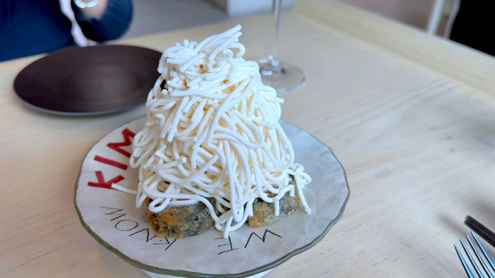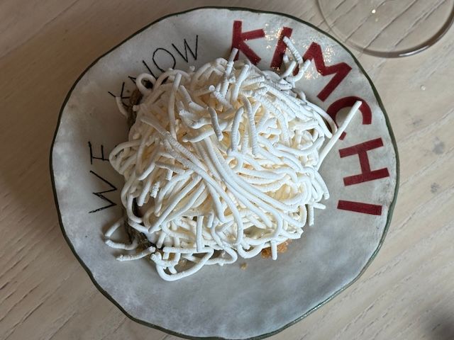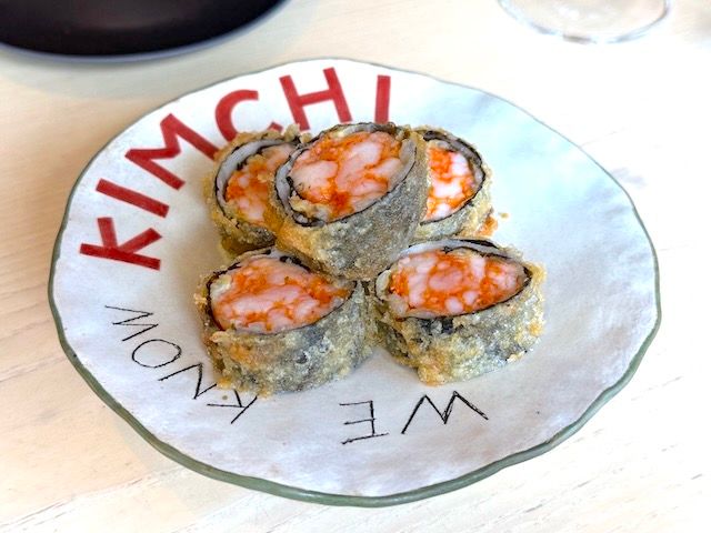 人気メニューは、キムチの天ぷら。なんと白菜キムチ、エビ、ニンニクの漬け物、唐辛子の漬け物を海苔で巻いて、天ぷらのように衣をつけて揚げているのです!さらに驚くのはこれから。ここにカリフラワートンチミサワークリーム(水キムチクリーム)を目の前でモンブランのように絞ってトッピング。テーブルで行われるショーのような演出にもうっとり。