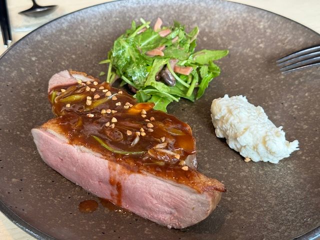 さらに筆者は、鴨肉ステーキと梅キムチを注文。こちらは先進的な味というよりはシンプルに梅の酸味やきのこの旨みが鴨肉のジューシーさと相まっておいしい一品でした。