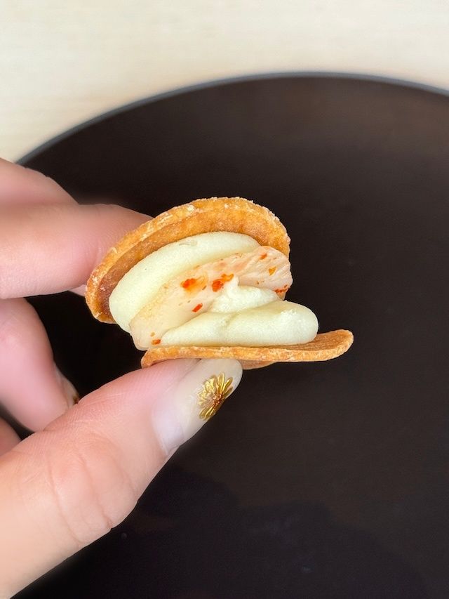 と説明があり、朝鮮文化をモダンに昇華したプレゼンテーションもフォトジェニック。中にある緑の薬草ベースのドリンクはノンアルコールで、食事前の口をスッキリと整えます。フィンガーフードもさつまいもムースとキムチで、キムチが冒頭から使用されています。