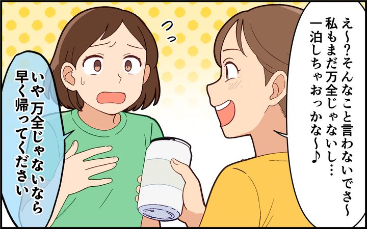マイペースで強引な性格の義姉を苦手に思っている妻。距離を置きたいのに、妻夫婦が出産を前に戸建てを購入すると、引っ越し祝いにかこつけて家族で新居に押しかけてきた。しかも義姉は前日に胃腸炎と診断されたと笑い、トイレを占拠。義姉の娘が嘔吐しても片付けを妊娠4ヶ月の妻に丸投げ。その非常識っぷりに、妻は我慢の限界で…!?