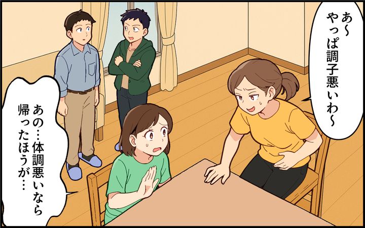 マナー知らずの義姉を苦手に思っている妻。できたら距離を置きたいのに、また義姉が家族で遊びにやってきて…。引っ越し祝いにかこつけて押しかけてきたが、なんと昨日胃腸炎と診断されたばかりだと言う。病気の時に妊婦のいる家にくる非常識さに唖然としていると、お腹が痛くなったと言ってトイレに駆け込んでしまい!?