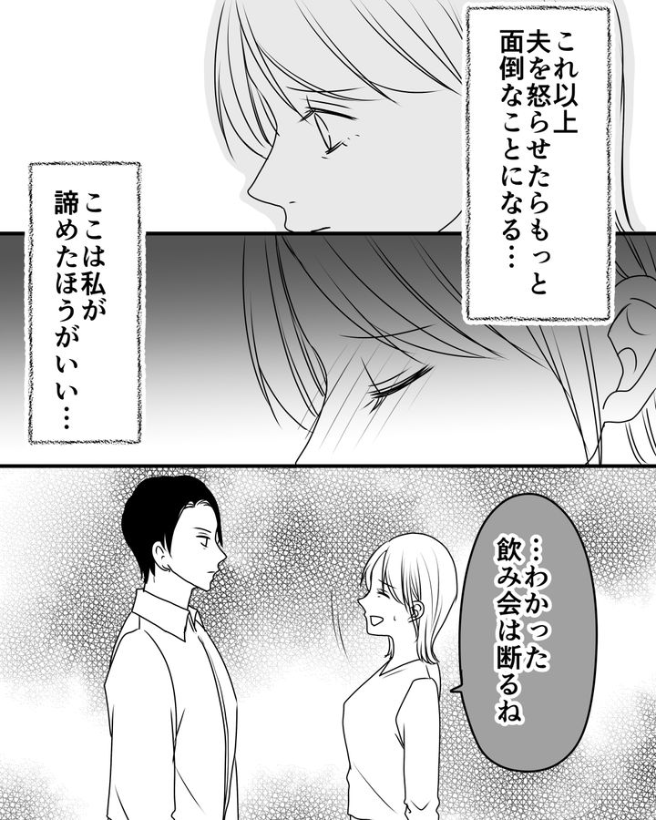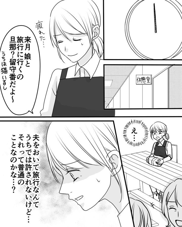 家族思いだからこそ過保護になる夫に従ってきた真美は、中学生の娘の美大進学の夢を応援するため外で働きたいと思うように。最初は夫に反対されるが、条件付きで許可が出る。しかし職場の歓迎会に出席したいと伝えると夫は大反対。真美は娘が小さかった頃、連絡しないでママ友親子と出かけた際に、夫を激怒させてしまったことを思い出し…。