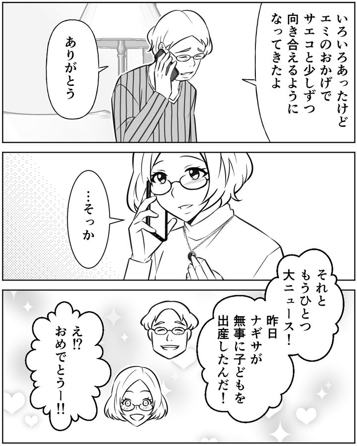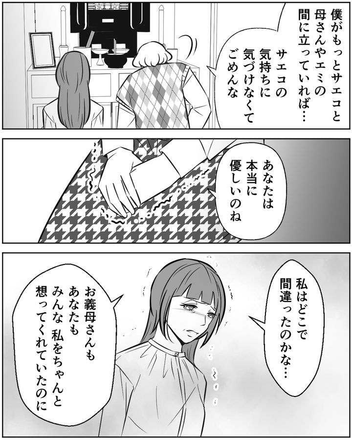 「義母にお金を無心する姿が嫌だった」「これ以上関わりたくない」と実の娘・ナギサから絶縁を言い渡された義姉。自分のやっていたことは嫌っていた実母と同じだったのだとようやく気づいたようだ…。義姉との軋轢な関係を乗り越え、エミは母の遺品である宝石箱を持ち帰ることができたのだった。