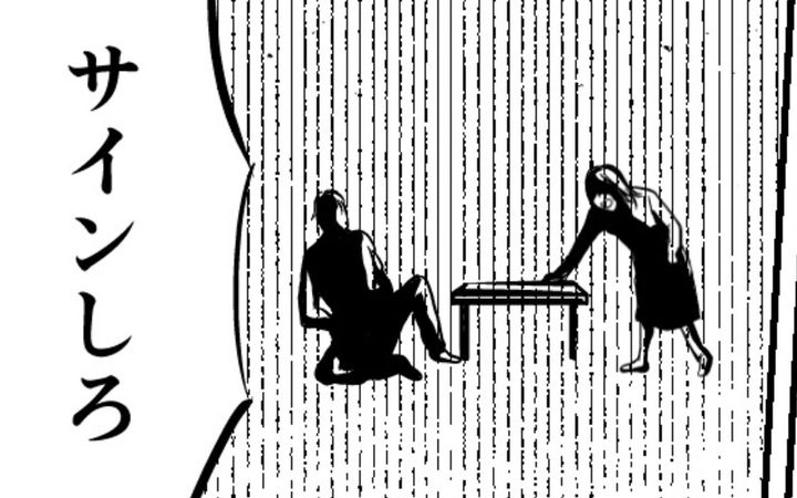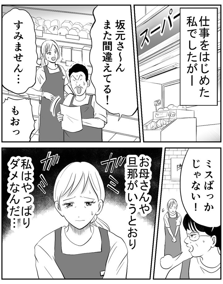 仕事も家事もせず家族に当たり散らしてばかりいる夫と別れたい。しかし実家は頼れず、シングルでやっていけるか自信がなく離婚を先延ばしにしていた。仕事が見つかった矢先、夫から「おれたち本当に離婚するの?」と聞かれる。離婚ですら自分で決断できない自信のない夫のように息子を育てまいと妻はかたく決意する。