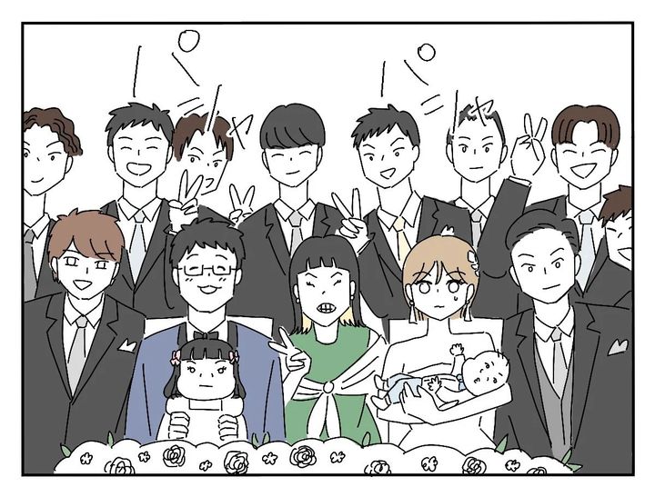 前の話を読む。披露宴で自分の子どもたちをゲストに自慢しまくる新郎の友人・花田さん。新郎新婦の写真撮影に乱入し、我が子を新郎新婦に抱っこさせる自分勝手な行動に出て…。