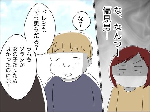 彼は息子は男の子だから厳しく育てている、ひろ子さんたちの家の子は女の子で楽だからいい、と差別発言を展開。そのうえ「ソラシが女の子だったらよかったのに」なんて…。