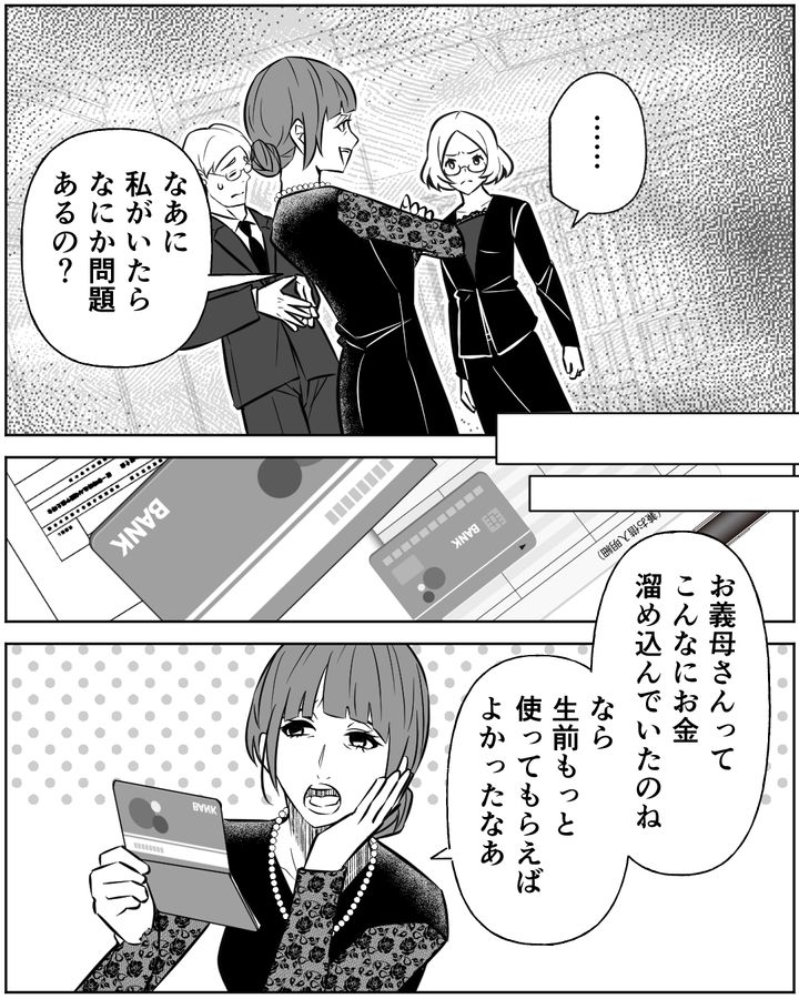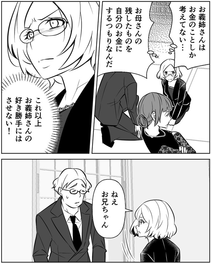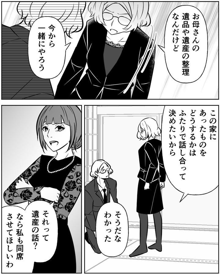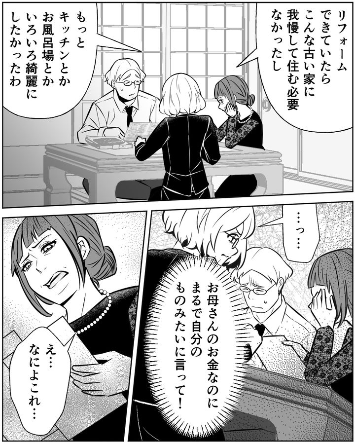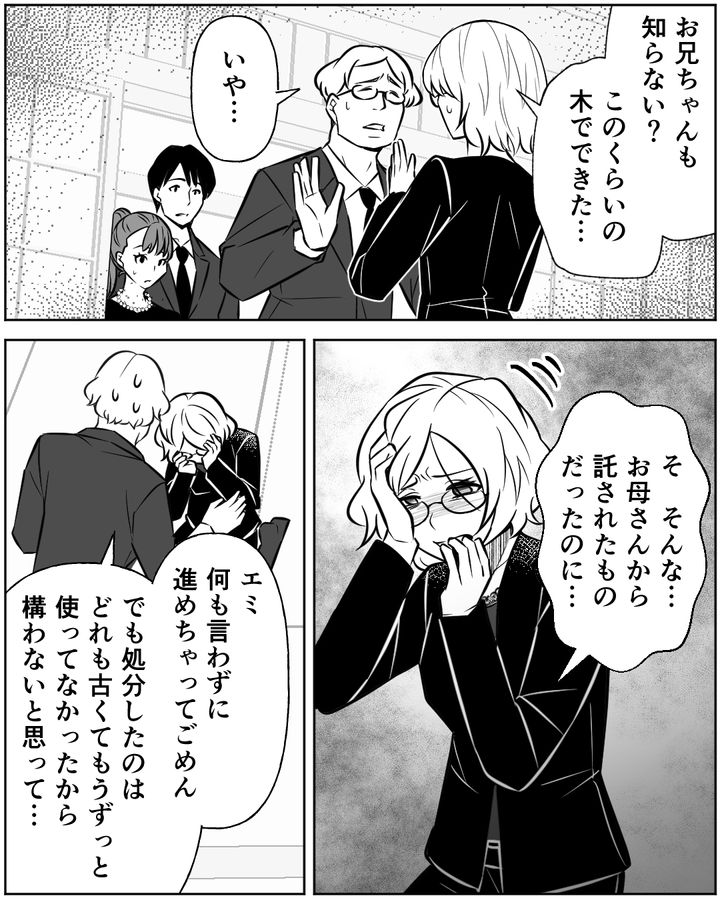 法要が終わって実家に戻ったエミは、母が暮らしていた母屋で今は兄夫婦が生活している事実を知る。母屋の様子はすっかり変わってしまい、母の大事にしていた家具がなくなっていることを義姉に問い詰めると、義姉は「邪魔だから売り払った」と言ってきて…。