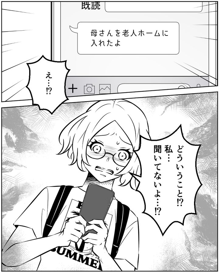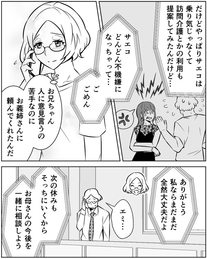 仕事が休みの日は母の世話に通っていたエミ。疲労がたまる生活を数ヵ月続けていたある日、夜遅くに母から連絡が。ほぼ毎週会っているのに「最近顔を見せてくれないね」と言うのだ。母の様子に戸惑うエミは…。