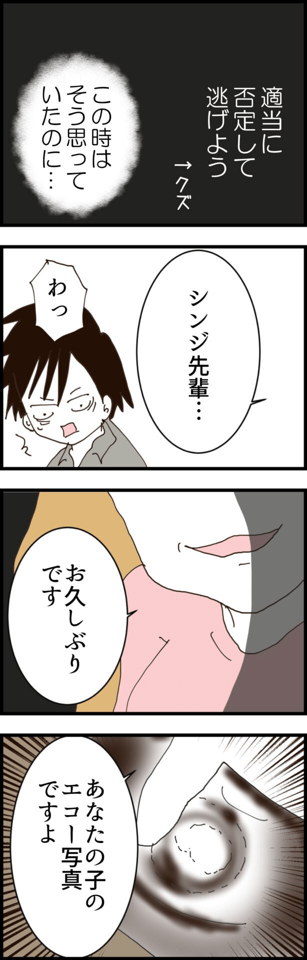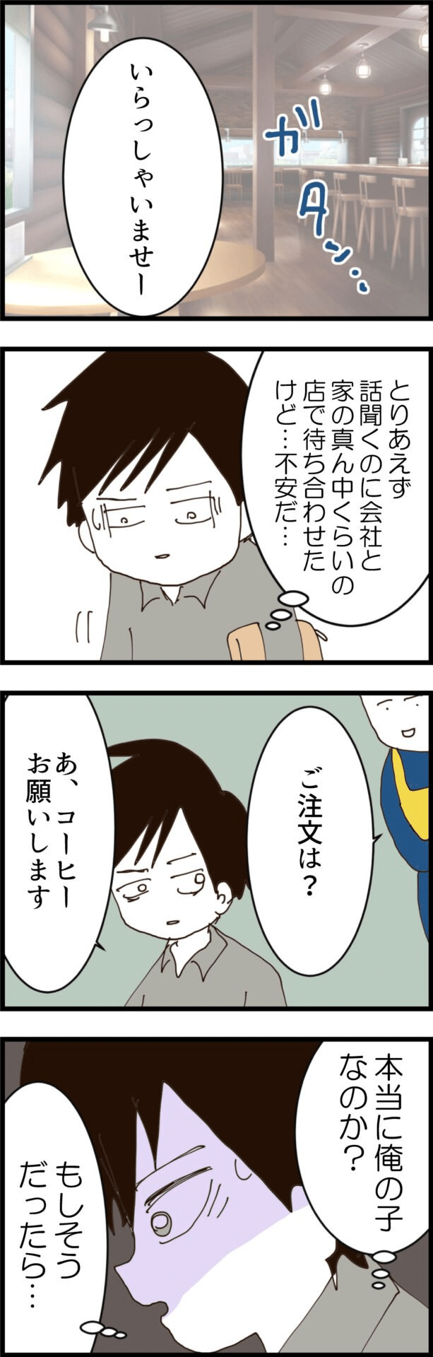後輩を待つ間、もし本当に自分の子どもだったら…と考えながら血の気が引いてきます。ただの言いがかりだとは思ったものの、その話が事実ならば、否定して逃げようと卑劣な考えまで浮かんでいるようです。