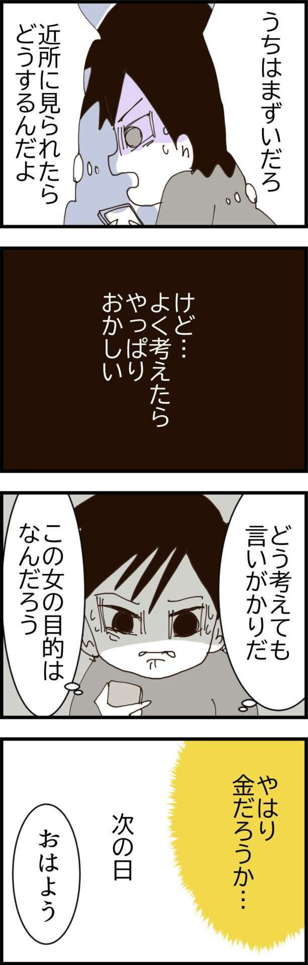 後輩が家にまで来て、近所の噂にでもなったら困る…。しかも、記憶のないあの日に何かあったとはやはり考えにくい。夫は後輩が何か企んでいるに違いないと考えているようです。