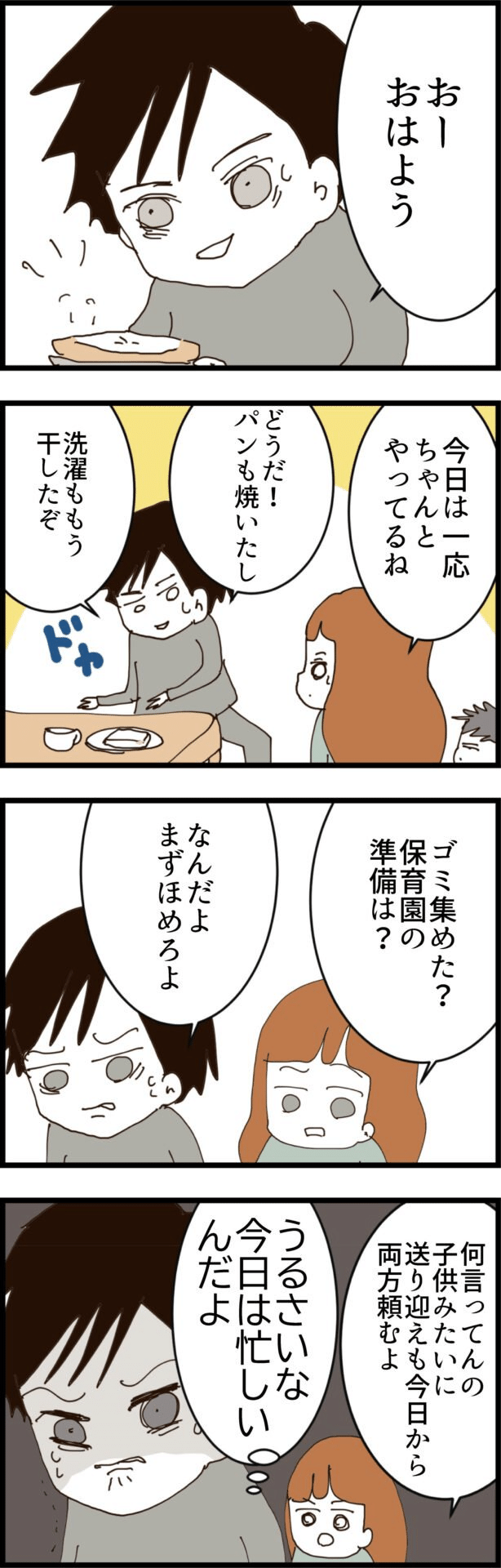 翌日、朝から夫はテキパキと家事をこなしていきます。妻からあれやったの? これやったの? と催促されイライラする夫、このあと後輩と話をつけに行くのでしょうか…?
