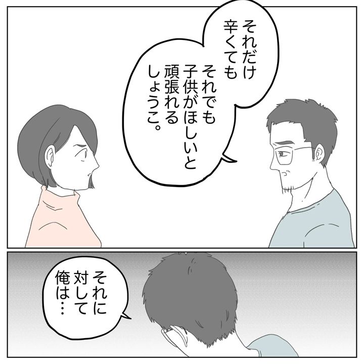 自分が不妊の原因だと知らされてから、つらい副作用を経験しながらここまでがんばってきた夫。もちろん妻も別の形でつらい思いをしてきたと思います。