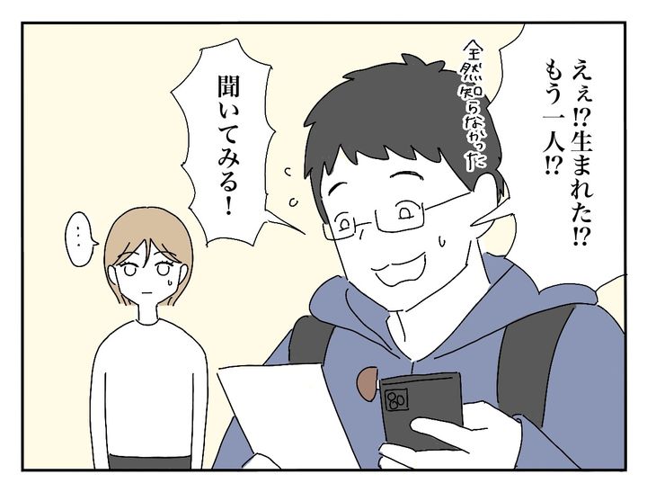 新郎の友人・花田さんからのメッセージを見て驚きが隠せない新婦。あわてて新郎に見せたところ、新郎も「花田さんが2人目を出産したこと」は知らなかったようです。