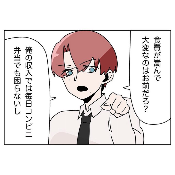 夫は幼少期の家庭環境から、夫婦は対等であるべきと考えつつも、妻に指摘されると逆ギレや言い訳を繰り返します。妊娠が発覚しても生活費は折半でと言い、妻に負担を押しつけます。母に妊娠を報告した際、いい夫を演じるも「家事をしている」という嘘はすぐに見破られました。母に諭され夫は「明日から夕飯を作る」と約束しますが、初日で挫折し、毎日コンビニ弁当を買って帰るように。食費がかさむので妻が「私が作るよ」と言うと夫は逆ギレし責任転嫁。「だったら最初から自分で作ったほうがおいしいと言えばいい」と開き直るのでした。