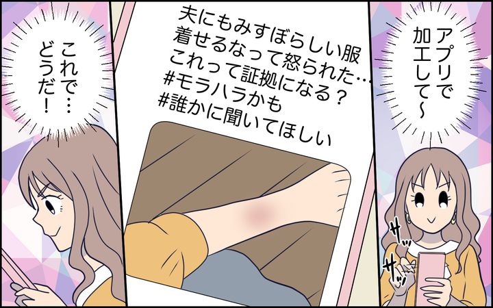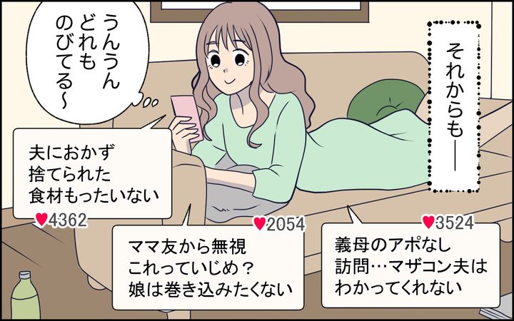 このままふつうの専業主婦で終わるのかという焦りを感じていた妻は、ある日、夫を悪者に仕立てた投稿で注目を集める喜びを知る。承認欲求を刺激された妻はSNSへの依存を強めていき、わざと皿を割ったり、部屋を散らかしたりしてワンオペ育児をアピール。不幸な投稿がバズる鍵だと気付き、より刺激的なネタを探し始め…?