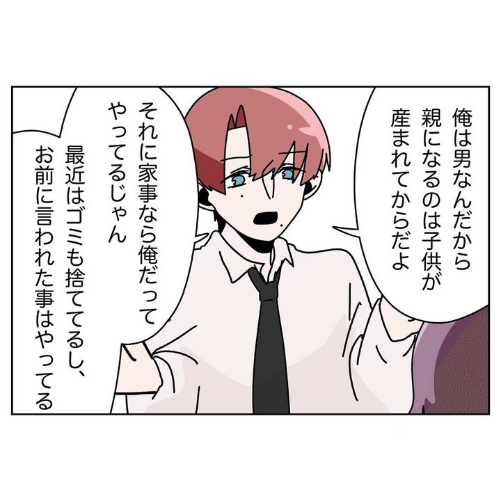 妻に「親になるんだから、これからは家事をして」と言われた夫は、「男が親になるのは子どもが生まれてからだ」と、とんでもない言い訳をします。