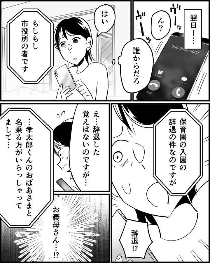 義母が夫に若い女性を紹介した翌日、市役所から電話がありました。内容は「保育園の入園辞退について」で…。まったく心当たりのない話に驚愕した私。