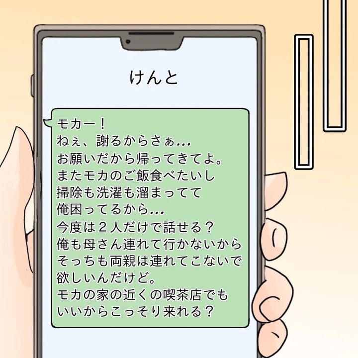 しかもメッセージには、「またモカのご飯が食べたい」「掃除も洗濯も溜まってる」などと自分勝手な言葉が並んでいます。せめて「今は料理も作ってる」「選洗濯も掃除もやってる」とアピールするところだろ! と思いますよね。