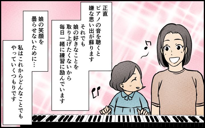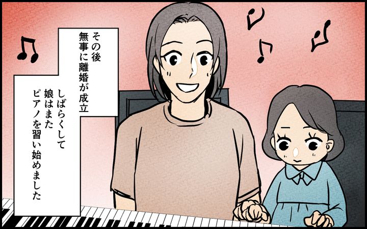 その後、離婚が成立し、娘はまたピアノを習い始めました。私は今でもピアノの音色を聞くと胸が苦しくなりますが、娘の好きなことを応援したい一心で、毎日一緒に練習に励んでいます。