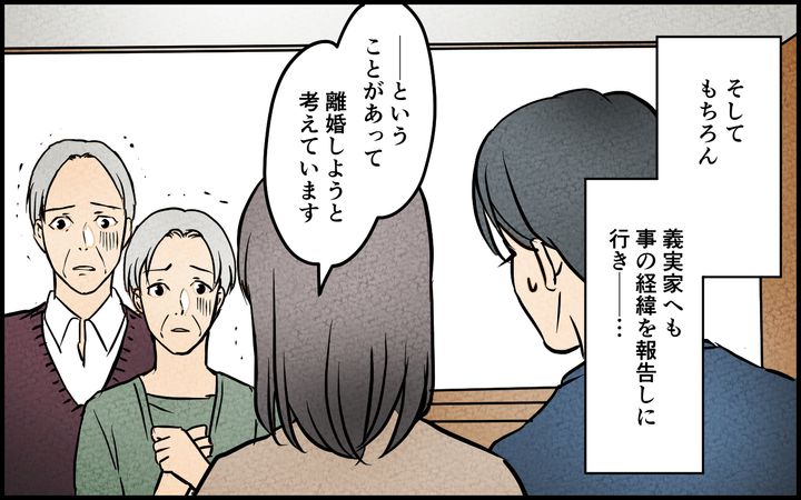離婚するにあたって、義両親にも夫のしでかしたことを報告しに行きました。すべてを知った義両親はとても驚いたようでした。