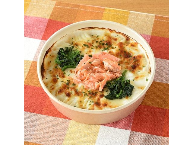 もちもち食感の生パスタを使用したグラタンです。魚介の旨みのきいたクリームソース仕立てで、クリームソースと相性の良い鮭、ほうれん草、チーズをトッピングしました。 ※宮崎県、鹿児島県では取り扱いがございません。