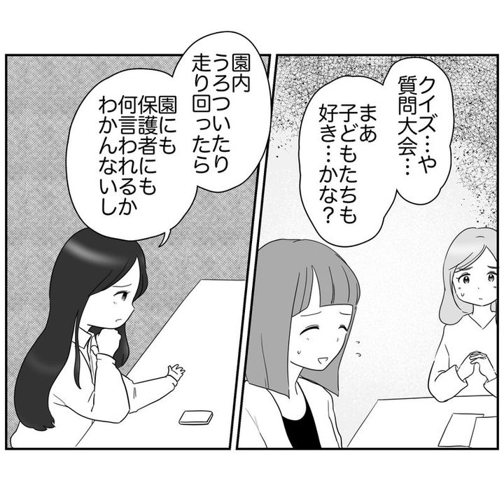 年長の娘を持つミカは、卒園式後のお別れ会役員に立候補。しかし会議にはリスク回避に徹底的なヒラマツさんが現れ、持ち上がった企画案が「何かあったときに責任が取れない」と次々に却下されてしまう。