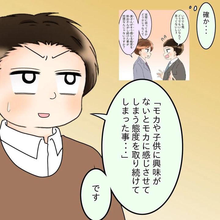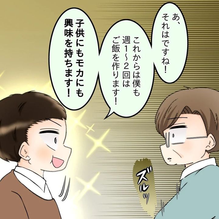 里帰りから数週間後、自由気ままな生活を送っていたけんとは、とっくに出産予定日が過ぎていることに気づく。慌ててモカに電話すると、財産分与や養育費など、具体的な離婚話をされてしまう。その後、部下から「もし一生奥さんが料理を作らなくても一緒にいたいのか」と聞かれたけんとはモカとの関係を考え直すが、どうしても“自分が料理を作る状況”に納得できなくて…。