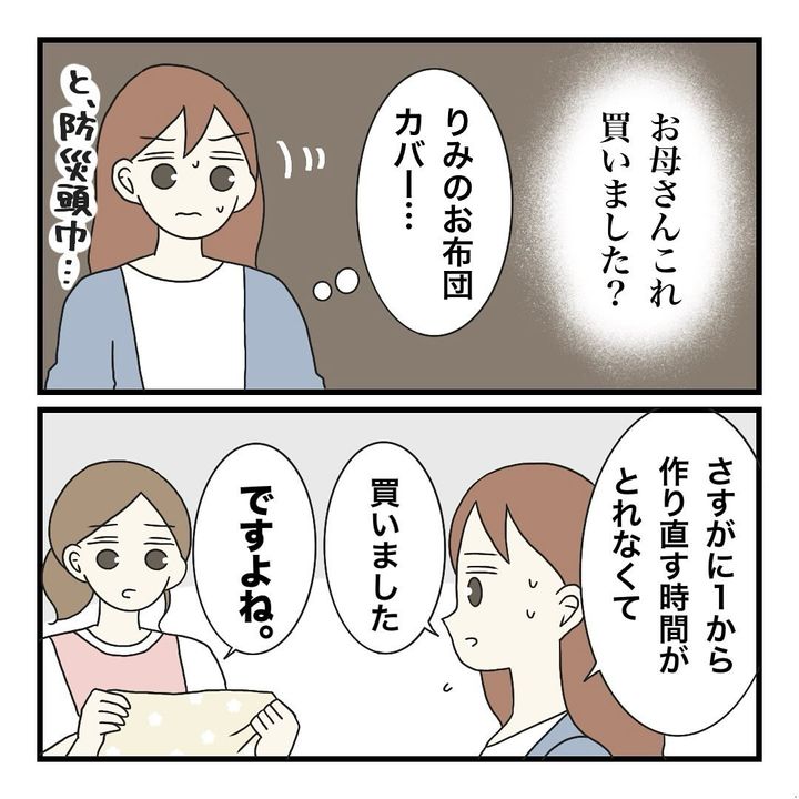 買った布団カバーだとサイズが少し違うので、四隅に紐をつけるよう言われたまりな。受け取ってもらえず、再度家で裁縫作業をすることになりどっと疲れが出ます。