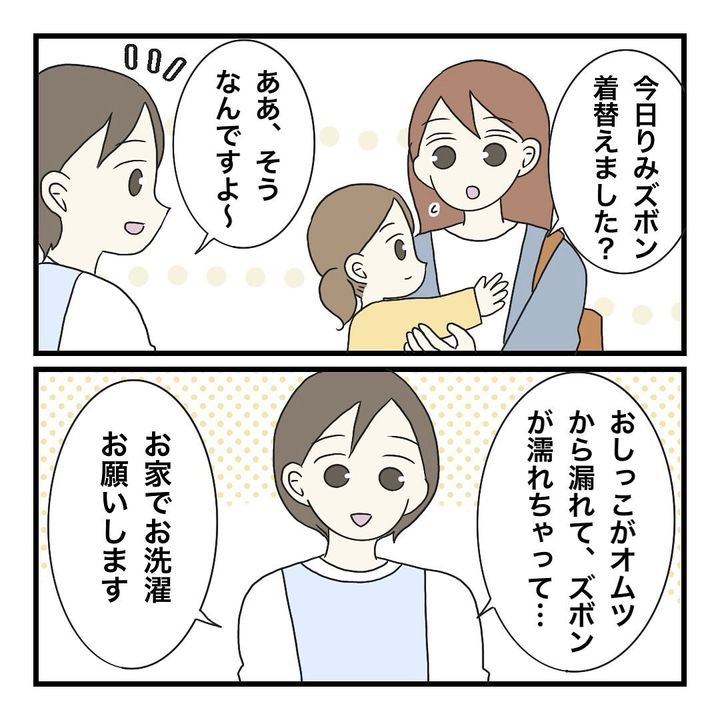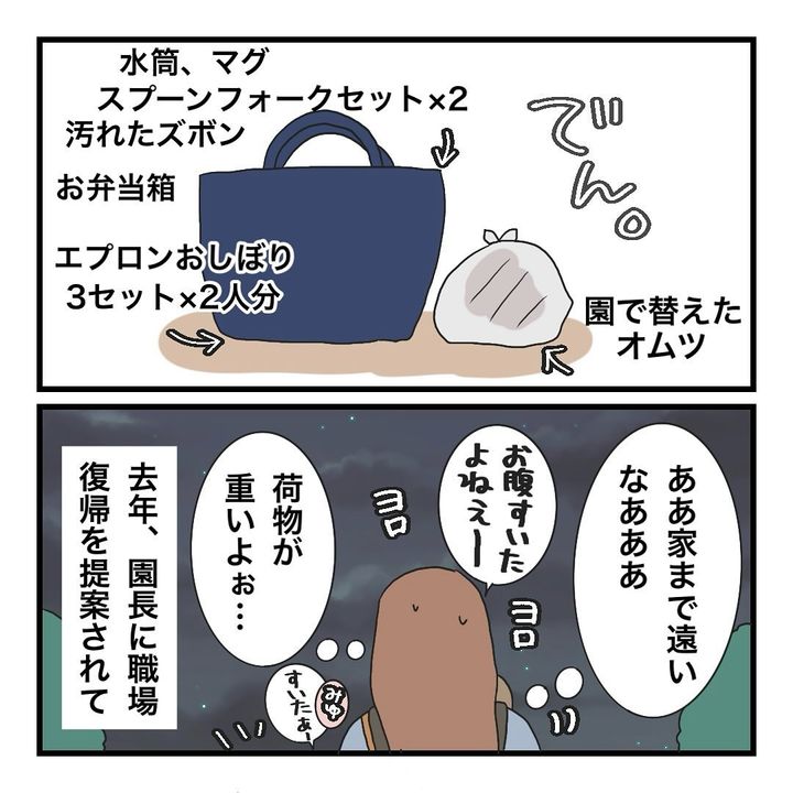 下の娘のズボンが汚れたことで洗濯物が増え、さらには使用済みのオムツ、そのほかの洗濯物や洗い物など、保育園の帰り道は荷物がいっぱいで…。