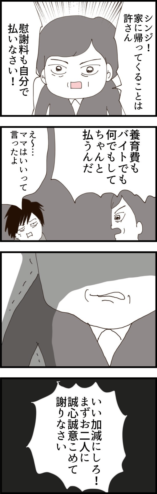 ずっと黙って見守っていた義父が、夫と義母の無責任な態度に限界を迎え、ついに厳しく叱責。実家に帰ることは許さず、慰謝料と養育費は自分で支払うように命じました。