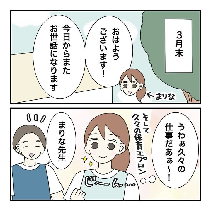 3月末、以前働いていた保育園に保育士として復帰したまりなは、娘たちの通う保育園との違いをまざまざと感じていて…。