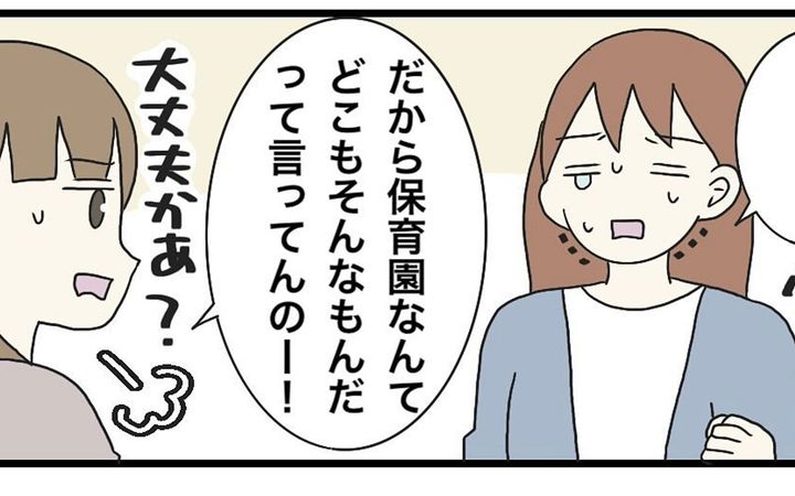 保育士として復帰することになったまりなは、娘ふたりの保育園が決まり説明会を訪れる。しかしその保育園は「あたたかみがある」という理由で布団カバーなどは手作りで統一、週1お弁当にオムツの持ち帰りと、保護者の負担が多いのだった。そこで同じく保育士の妹に愚痴ると、妹から「そんなの普通じゃん」と言われてしまう。さらに「まずは保育園に慣れようとしなよ」と喝を入れられるが、まりなには思うことがあり…。