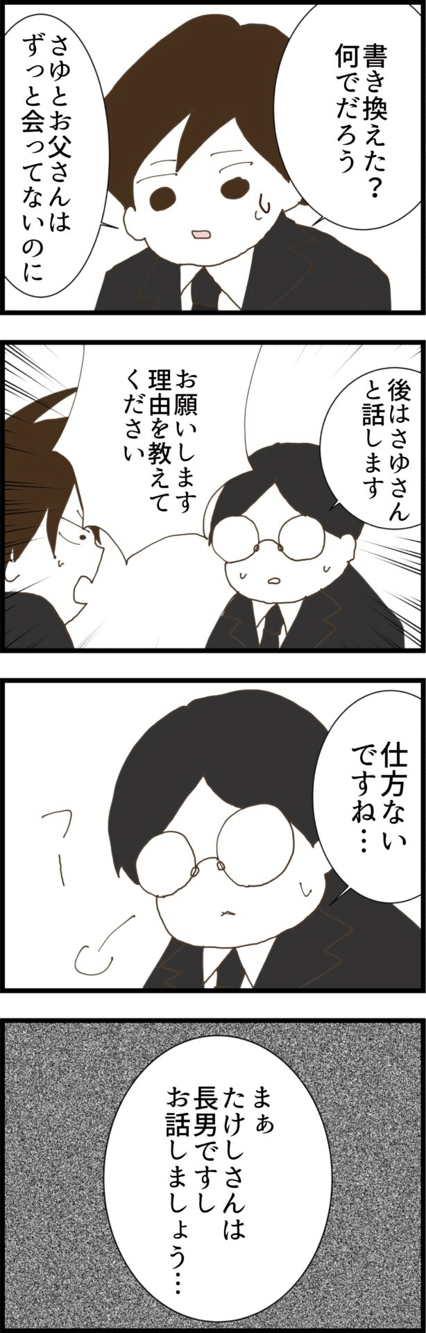 妻と義父はずっと会っていないのに、遺書が書き換えられた理由がまったくわからない夫。あとは妻と話すという弁護士に頼みこみ、理由を教えてもらうことに。