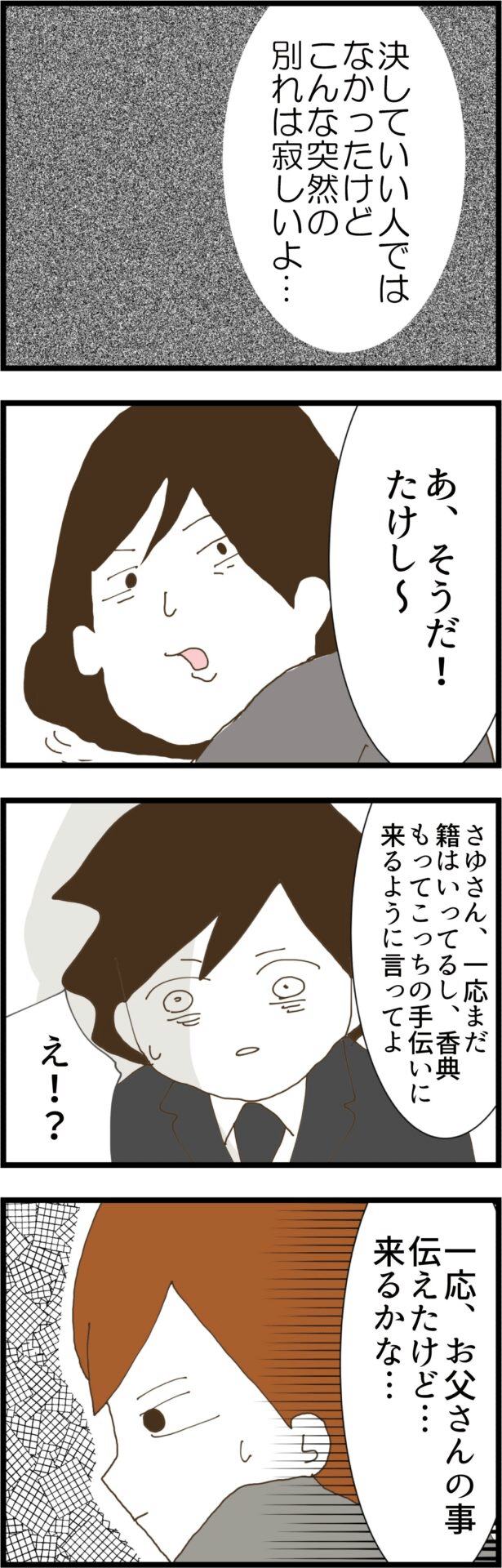 突然父親を亡くし、寂しさを感じている夫をよそに、義母と義姉はしたり顔を見せているのでした…。