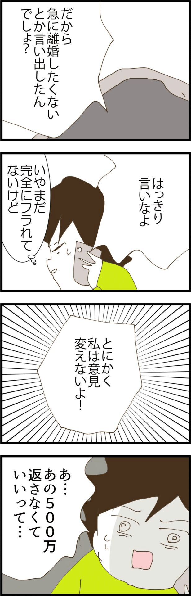かおりが音信不通になった理由を知らない夫はまだフラれてはいないと心の中で主張しながらも、何があっても離婚をするという妻を説得するため、「500万円を返さなくていい」と伝えました。