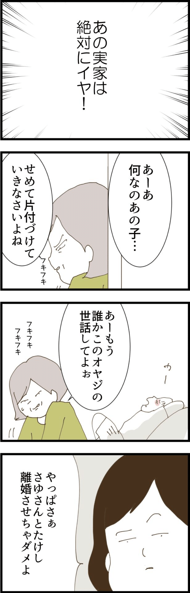 義母も義姉も、面倒な義父の世話を押しつける相手が欲しいだけ。そのためにも、さゆと夫を離婚させるべきではないと考えているようです。