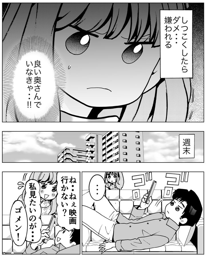 前妻との間に息子がいるバツイチの夫と結婚した妻。それまでの婚活がうまくいかなかった経験から重い女を封印し、妻は夫に対しては常にポジティブな発言を心がけていた。しかし、夫は元の家族を優先してばかりいる。妻のご機嫌をとるためにふたりの子どもが欲しいと伝える夫だが、内心ではまだ元嫁のことが好きで、妻のことは復縁が叶うまでの都合のいい家政婦としてキープしているだけだった。