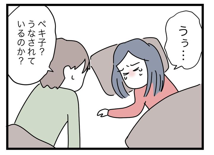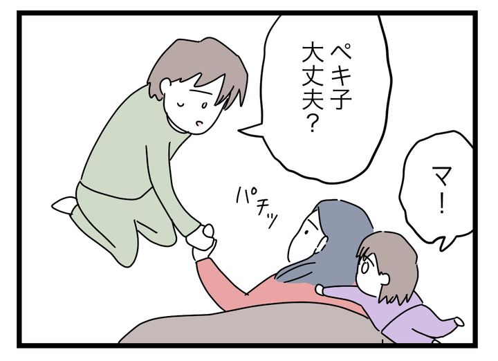 うなされているペキ子が心配で、声をかける優一。娘のカンちゃんも「マ!」とママを呼んでいます。