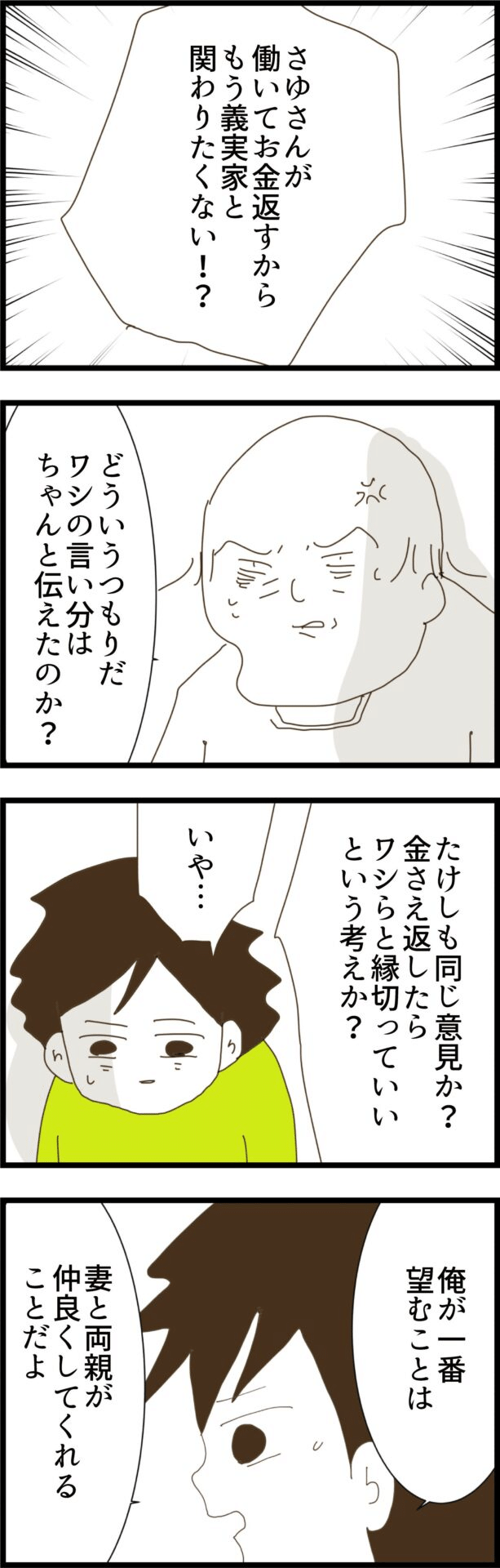 毎週の義実家での食事会で嫌な思いをしている主人公・さゆ。妻がお酌を嫌がっていると夫から聞かされた義父は激怒し、離婚して家を建てるために援助した500万を円を返せと言い出します。義父の理不尽な要求に、妻は働いて500万円を返すと決心。夫はこの妻の思いを伝えるため義実家へ行きました。その途中、幼馴染のかおりに出会い、彼女も一緒に義実家へ連れていくことにしました。かおりはすっかり義父母と義姉に気に入られ、義父はかおりとの再婚を夫に勧めようとします。義父は妻との離婚を強く希望しており、義父の考えは絶対に変わらないのだと絶望する夫。妻の思いもきちんと伝えるため、夫は意を決して話をしました。