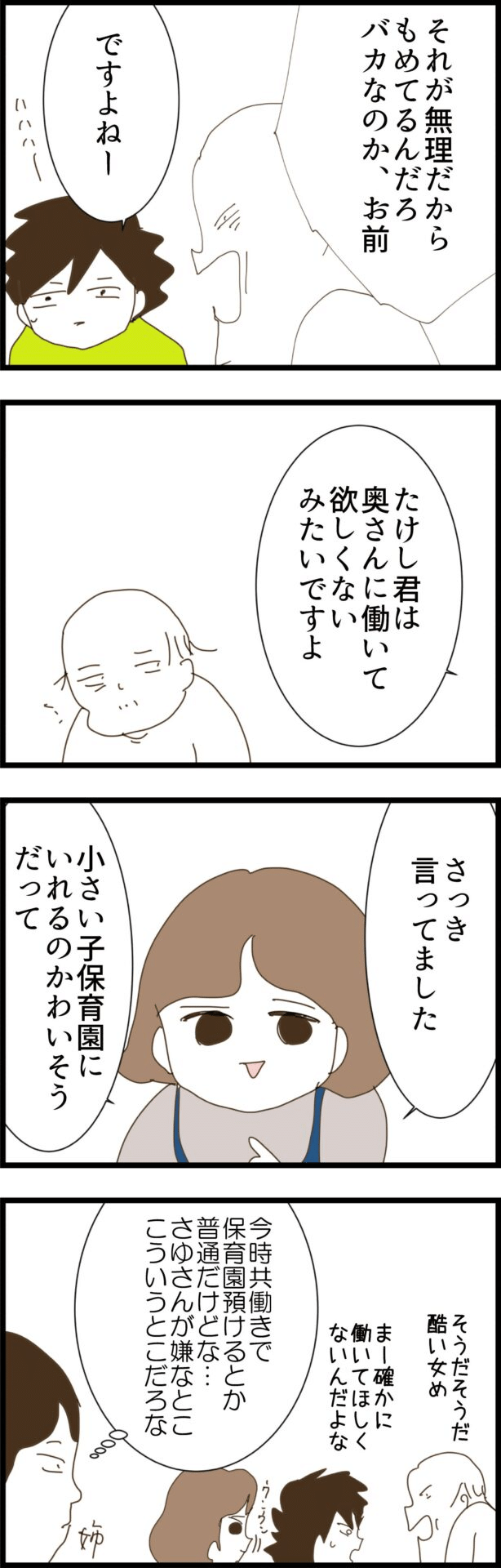 義姉はその様子を見ながら、「今時、共働きは普通のことなのに…」と妻の気持ちも理解しているよう。しかしその言葉を投げかけてしまったら、「両親の面倒を見てもらう」というせっかくの計画が台無しになると、心の中で留めているようですね。