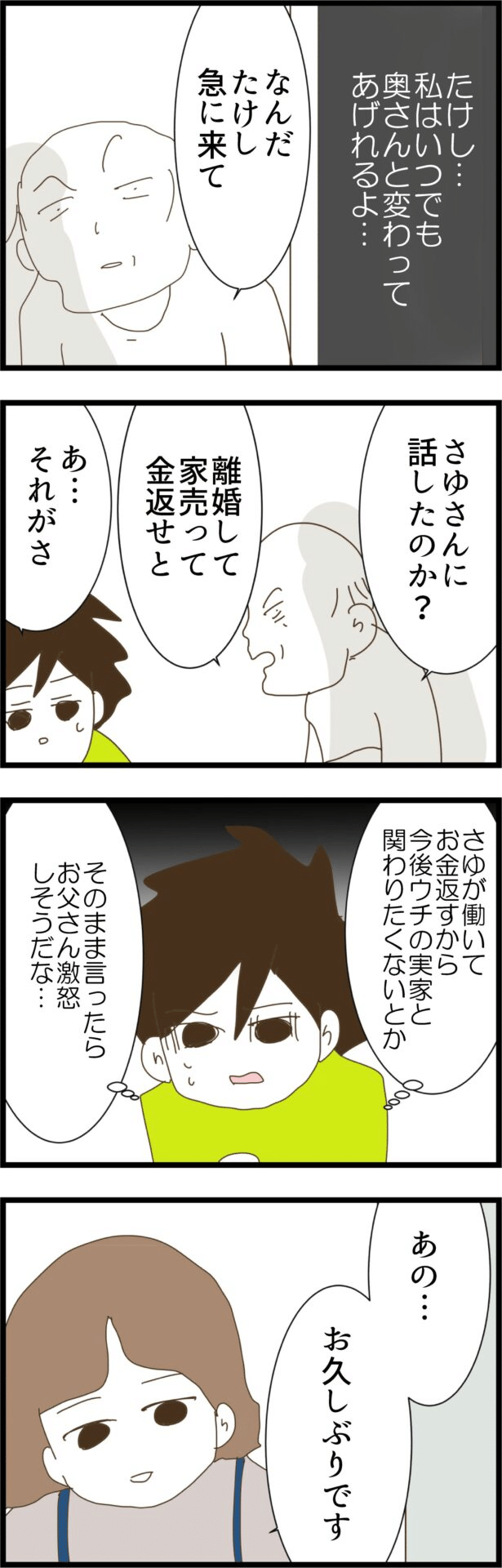 古臭い考え方を押しつける義実家に悩まされていた主人公・さゆ。義実家での毎週の食事会が苦痛でした。ある日妻が不在の時に、夫は妻が嫌な思いをしていると義父に伝えます。激怒した義父は離婚して援助した500万を返せと言い出しました。それを聞いた妻は働いて500万円を返す決意をします。夫婦の意見として夫が伝えるため義実家に向かっていると、幼馴染・かおりにバッタリ遭遇。妻には専業主婦でいて欲しいと本音を漏らす夫に、かおりは妻がワガママだと賛同。かおりは先日婚約者にフラれたばかりで、好きな人と結婚できるだけでも幸せなのに何が不満なの? と妻に対して怒りのような感情がわいていました。そして、義実家へ行く夫に同行すると言い出したのです。