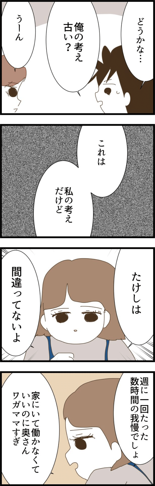 妻の気持ちはある程度理解したものの、やはり妻は家にいて家事育児に集中して欲しいという夫の気持ちはまだ譲りたくないようです。