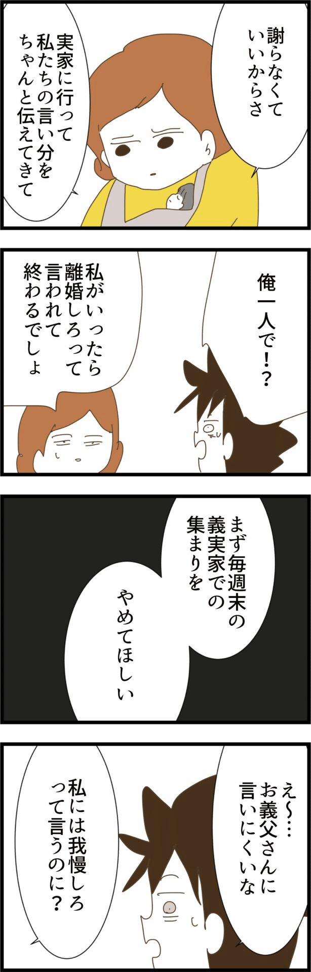 義実家での毎週の食事会で嫌な思いをしている主人公・さゆは離婚を考えるほど悩んでいました。夫の家族が家に来ることになったので、実家に帰った妻でしたが、妻の代わりに義父のお酌をしながら動き回る夫は初めて妻の大変さを理解します。時代錯誤な考え方をもつ義父に、妻は嫌気がさして実家に帰ったのだと伝えると、義父は離婚して新築に援助した500万を返せと激怒。翌日話を聞いた妻は、夫に我慢すれば良かったじゃんと言われ我慢の限界を迎えます。妻の大変さを理解したはずなのに、専業主婦の妻が俺から離れることはないと思っていた夫は、どこかで妻が犠牲になればいいと思っていたことに気づき、初めてきちんと妻に謝罪するのでした。