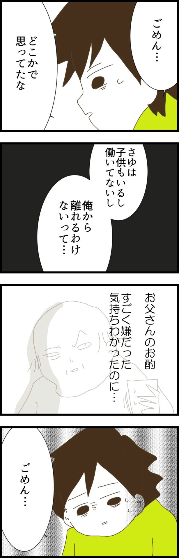 主人公・さゆは、義実家との関係性に深く悩んでいました。特に義父はお酒が入ると距離感が異常で、あまりの気持ち悪さに耐えられないほど…。夫の家族が家に来た日、妻は実家に帰りましたが、日頃妻がどれだけ大変な思いで義父の相手をしているかを理解した夫。何を言っても手酌は絶対にしないと頑固な義父に、夫は妻が嘘をついて実家に帰ったことを告白してしまいます。激昂した義父から離婚して家を売り、援助した500万を返せと言われてしまった夫は、翌日妻に報告。妻が我慢すればこんなことにはならなかったと自分のことしか考えない夫に、妻は激怒し、仕事もしてないし子どもも小さいからどうせ何を言っても離婚されないと思ってるでしょ!?と問うのでした。
