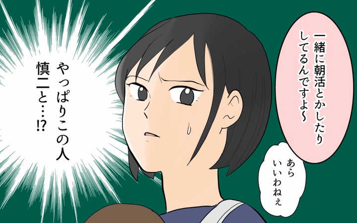 夫の単身赴任中、初めての育児をワンオペでこなしていた妻。ようやく夫が戻ってくるも、夫と見知らぬ女性が会っているのを妻は目撃してしまう。夫が言うには朝活仲間らしいが、妻が娘を連れて行った病院でその女性は看護師をしていた。夫と同じ時期に同じ地方からこちらへやって来た謎の女性。また別の日、妻と娘が病院に行くと、彼女から声をかけてきて…。