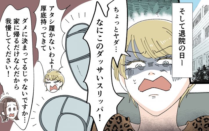 50代でギャルな義母。なぜか夫はいつも義母に冷たく、妻はひとりで対応するはめになっている。そんな義母は幼稚園の遠足にボランティア参加し、子どもをかばって転倒してしまう。骨折して入院することになってしまったが、駆け付けようにも妻は娘と遠足の真っ最中。夫に連絡すると「別にどうでもいいあんな人」と突き放されて…。