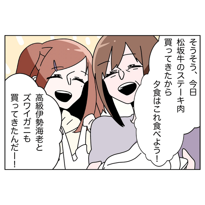 母と妹は、夫のことを「お前」と呼び方を変えながら、生活費は折半だと告げます。さらに高級食材を次々と買い込み、「食費も折半でしょ?」とにこやかに手を差し出す母。