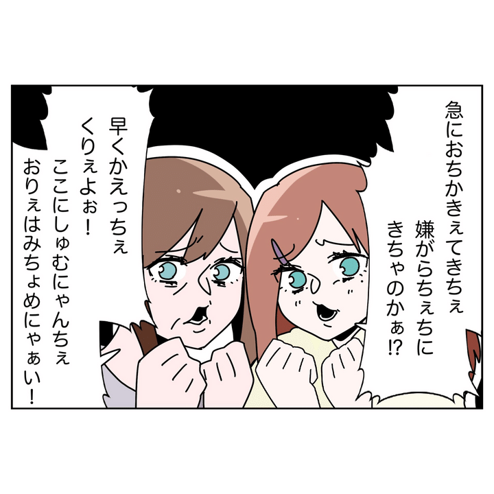 嫌味たっぷりの態度に激怒した夫は、「もう帰ってくれ!」と怒鳴ります。が、母と妹はそれを赤ちゃん言葉で繰り返します。