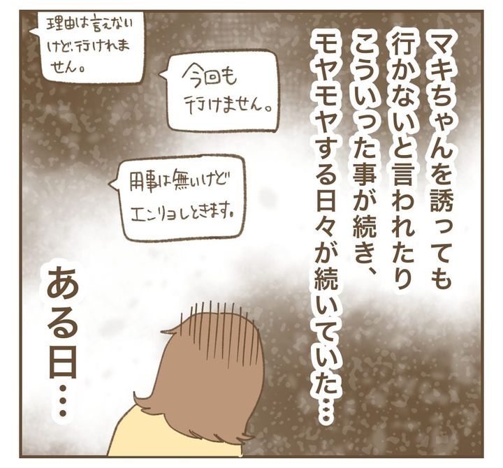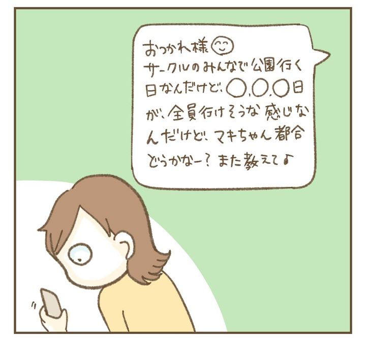 育児サークルを立ち上げ、仲間と交流していたねぼすけでしたが、マキちゃんの不可解な言動に戸惑う日々が続きます。ある日ねぼすけが近所で偶然会ったママ友との写真をSNSに投稿すると、マキちゃんのアカウントに不穏な小文字投稿が。誰かに怒っている…? その後、企画していたイベントのためのスケジュールをマキちゃんが未入力だったのでリマインドしようと思いますが…